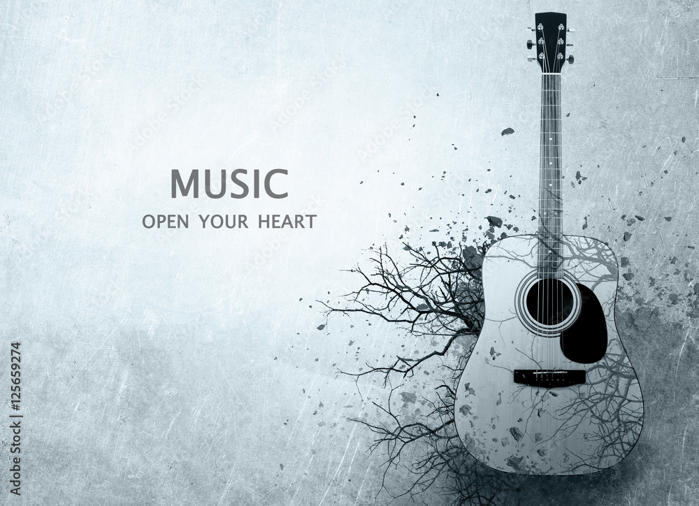 Acoustic Guitar With Leafless Tree Branches On Gray Background Text Music Open Your Heart Creative Art Work Concept Stock Photo Adobe Stock